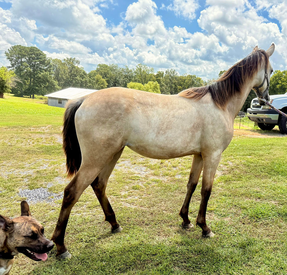 This beautiful buckskin filly with all black points was born in July 2024. Her sire is Coal Miner by Rowdy Rawhide and my tattooed standardbred mare. Her siblings are racking machines with a head full is sense. They are so easy to handle and move from the trot to the perfect four-beat gait and no pace. She will mature around 15.2 hands with a stocky body like her sire. This girl will be in the mid 20’s and smooth as silk. She is utd with shots and worming. She will do it all. Call 256-303-0603; Doug Ripley